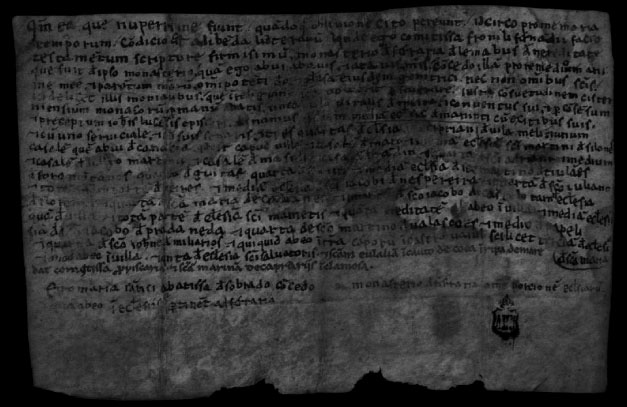 Por el contrario, la letra del segundo scriptor es correcta, obra de mano experta y cabe calificarla de protogótica documental. Podría datarse en un periodo muy amplio –entre el último cuarto del siglo XII y el primer tercio del XIII–; sin embargo, tomando como base conjuntos gráficos similares en otros testigos de la misma área geográfica, las mayores similitudes se advierten con los de diplomas fechados en la segunda y tercera década de la decimotercera centuria[48].