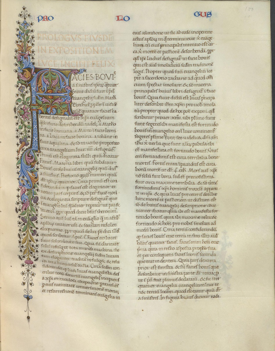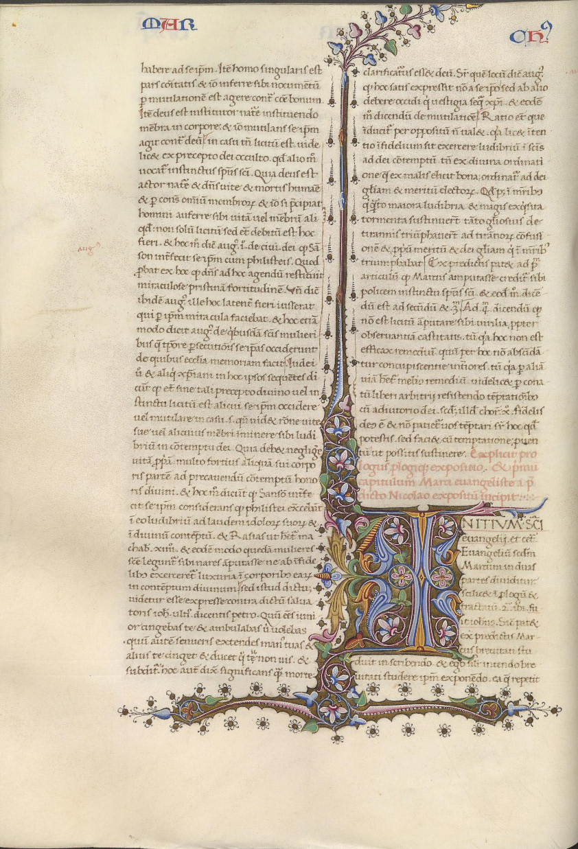 Otro aspecto que comparten el S-III-14 y el 332/148 es la ornamentación. Los dos fueron decorados con iniciales y orlas de Estilo Gótico Internacional que ofrecen motivos idénticos, a base de una cardina que surge de la inicial y que se prolonga por el margen enroscándose entre motivos vegetales, donde dominan el azul, el rosa lila, el verde y el naranja, con capullos de cardo cerrados y otros florecidos, de los que surge un elemento similar a una mazorca de maíz, más o menos alargada, junto a flores de cuatro pétalos, todo rodeado por lentejuelas de oro con cilicios (figs. 1 y 2). En la orla del margen derecho del principio de la obra que transmite el volumen escurialense (f. 58r), escondido entre los ramajes, hay también un putti no alado, de calidad, como lo es también la inicial historiada que representa a San Mateo en su escritorio en el f. 3r del 332/148. La decoración vegetal se distribuye entre las orlas y el interior de las iniciales, siendo más frondosa y rica en las capitulares del 332/148 que en las secundarias.