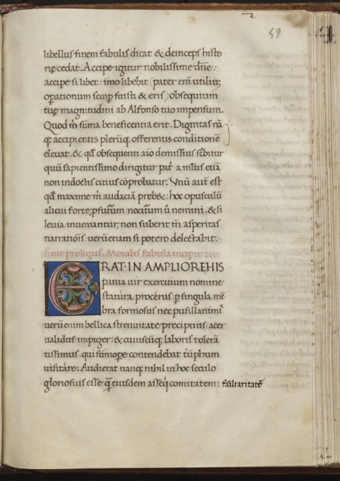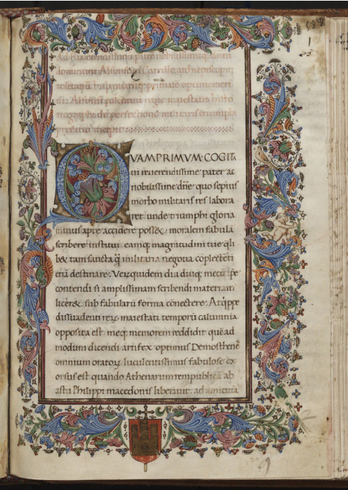 Figura 2. El Escorial, Real Biblioteca del Monasterio, S-III-14, f. 58r. Inicio del manuscrito autógrafo de Alfonso de Palencia dedicado a Alonso Carrillo de Acuña, que se copió e iluminó en Sevilla en 1457-1458.