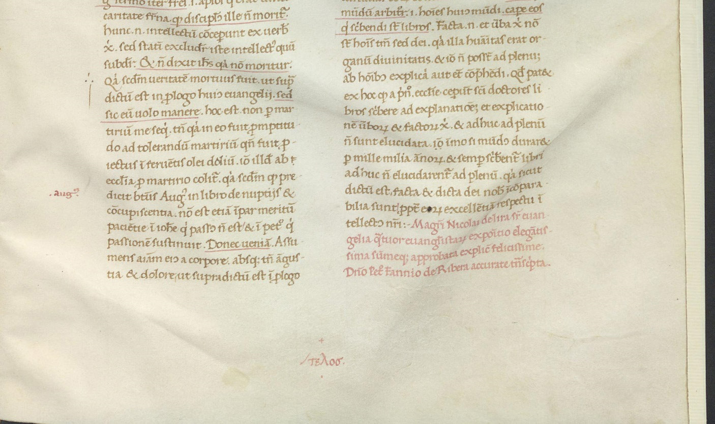 El volumen IV de la obra de Nicolás de Lyra copiado para Per Afán finaliza con un telós en caracteres griegos (fig. 3), al gusto de los humanistas italianos[17]. Dicho éxplicit tiene la peculiaridad de llevar una pequeña cruz colocada justo encima del término griego, igual que en los reclamos de los primeros cuadernos. No sabemos si el códice escurialense también habría cerrado la copia con un telós, porque falta el último folio, pero en otros tres manuscritos de Alfonso de Palencia esta fórmula está presente. La parte autógrafa del códice 68 de la Biblioteca General Histórica de la Universidad de Salamanca, con el De anima de Aristóteles, copiado en 1464-1465, finaliza en el f. 35r con un telós en caracteres griegos que lleva una pequeña cruz sobre la palabra, igual que en el volumen IV de las Postillae sevillanas. También llevan su correspondiente telós las dos secciones del manuscrito 95 del mismo fondo universitario, datado en 1464 y, por último, un tercer autógrafo del palentino, fechado en 1472, se remató con otro telós[18]. En cambio, no hizo lo mismo en el manuscrito que se conserva en Palermo de 1471, ni en el del Vaticano, ni en el a.IV.26 (ff. 78r-85r), ni en el volumen de la Biblioteca Nacional de España MSS/19439, ni en el Universal vocabulario del Escorial (f. II.11). En lo que coinciden los casos que llevan telós es en que todos son posteriores a la finalización del magisterio griego de Trapezuncio (1453), ya que el códice conservado en Princeton y copiado alrededor de 1450 tampoco se cerró con la palabra griega.