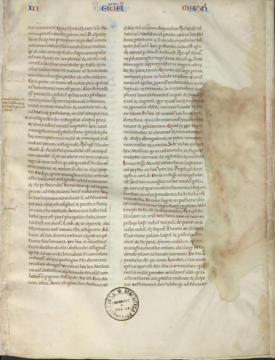 En el año 1990, María Luisa Pardo Rodríguez daba a conocer un códice conservado en la Biblioteca de la Universidad de Sevilla escrito en humanística redonda. Nos referimos al manuscrito 332/148 que es el tomo IV de las Postillae in Vetus et Novum Testamentum de Nicolás de Lyra (fig. 1), copiadas en cinco volúmenes para el Per Afán de Ribera que fue arcediano de Cornado en la Iglesia compostelana y que falleció en el año 1487[1]. Debido a lo poco que se sabía sobre el uso de la escritura humanística en Castilla cuando se publicó el mencionado estudio, la existencia de un manuscrito con estas características recomendaba no considerarlo un trabajo autóctono, sino un producto italiano. Sin embargo, María Luisa Pardo no llegó a descartar la posibilidad de una copia en Sevilla y, tras analizar la escritura, confirmó la presencia de un copista anónimo que utilizaba una humanística de tradición poggiana, concluyendo que habría realizado su cometido entre 1440 y 1460[2].