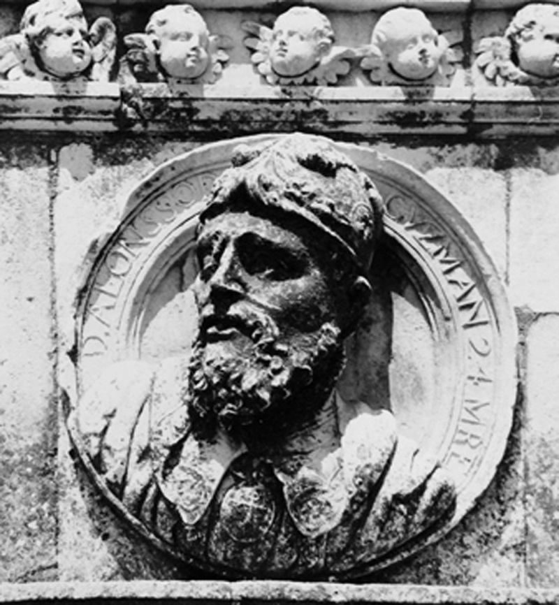 Medallón correspondiente al maestre Alonso Méndez de Guzmán en la fachada principal del convento de san Marcos, en León, En la inscripción figura como vigésimo cuarto maestre de la Orden de Santiago.