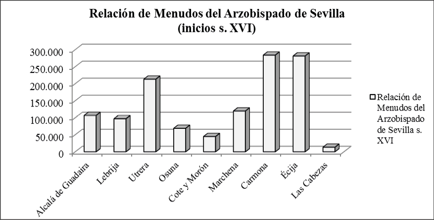Ilustración nº 1. Menudos del Arzobispado de Sevilla (ppos. s. XVI). Cifras: Carmona Ruiz, M.A., La ganadería en el Reino de Sevilla durante la Baja Edad Media . Sevilla, 1995.