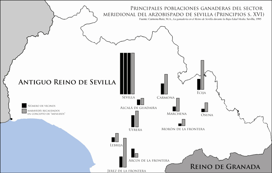 Son conocidos los avatares históricos que rodearon al sector meridional del antiguo Reino de Sevilla [2] . La amenaza de las razzias musulmanas derivada de la proximidad de la frontera con el reino nazarí de Granada, unido a situaciones como la debilidad demográfica de la región o la especial orografía de su territorio, hicieron inviable la actividad agrícola en la zona y que aquellos parajes silvestres, de montes, dehesas y tierras incultas, terminaran siendo aprovechados para la crianza de ganado. Dada la capacidad de adaptación a este contexto y su versatilidad, los animales se convirtieron muy pronto en pieza clave de su identidad y principal exponente de su riqueza [3] . Poblaciones sevillanas como Alcalá de Guadaira, Carmona, Écija, Marchena, etc. u otras tantas como Utrera, Lebrija, Jerez o Arcos, arrojaban a inicios de s. XVI unas cuantías elevadas en concepto de menudos recaudados por el Cabildo Catedral de Sevilla, señal inequívoca de los altos niveles de actividad y concentración de animales en este área [4] .