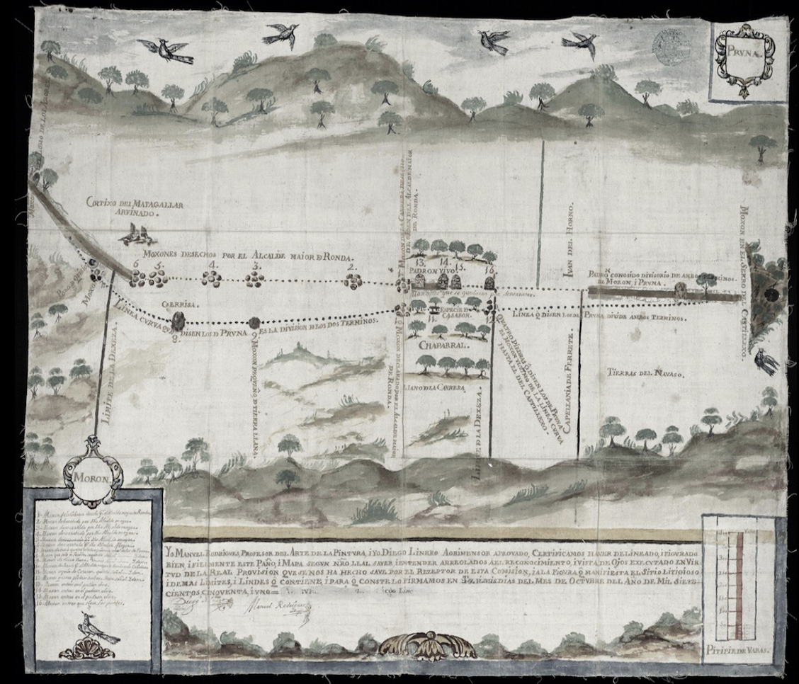 Ilustración nº 4. Paisajes de la Banda Morisca. Paño y mapa hecho a vista de ojos del límite entre los términos de los pueblos de Pruna y Morón de la Frontera (s. XVIII). Archivo de la Real Chancillería de Granada. Signatura: ES.18087.ARCHGR/059CDFI/MPD nº 70.