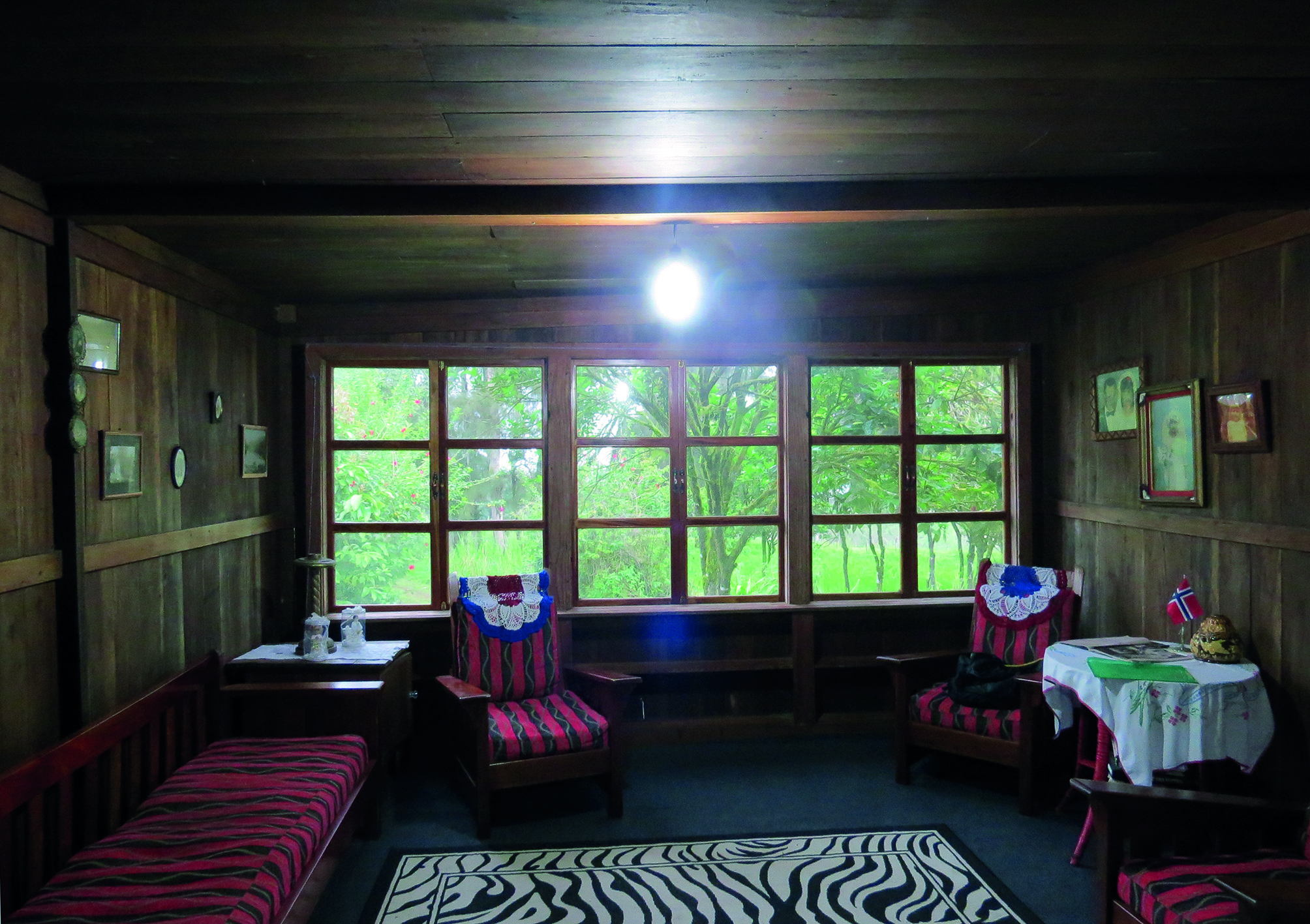 Volviendo a Miramar. Los camarotes han sido transformados en un vestíbulo que aún conserva las huellas visibles de los tabiques de madera. Una pequeña puerta apertura el espacio continuo del salón-comedor, una habitación ampliada que en el sentido nórdico captura la “estructura de interioridad doméstica explícita e inviolable” (Stoner, 2018, p. 66), definida por una envolvente de madera de pino oscurecida (fig. 9). En Miramar, la familia Kastdalen se miró a sí misma anteponiendo el pasado para otorgarle sentido al presente. En la autoconstrucción de la casa, Thorvald volvió a practicar la carpintería como una habilidad latente en su propio pasado, emprendiendo “un viaje creativo que permitió la reflexión, el descubrimiento personal y la representación del contenido autobiográfico en la materialidad de la vivienda” (Brown, citado en Samuel, 2012, p. 104, traducción propia). La familia Kastdalen construyó una escenografía íntima con los recuerdos más visibles de su patria: una bandera, antiguas fotografías familiares y recortes de entrevistas escritas en su lengua materna (fig. 10). Objetos que custodian las memorias y actúan como anclajes materiales de referencia simbólica y subjetiva; una capa in-material que hace posible abandonar físicamente un territorio sin perderlo del todo (Reyes y Martínez, 2015). A través de los objetos se materializan las biografías de vida, los lugares de origen y de arribo interactúan, negocian y disputan la construcción de nuevos espacios de vida y experiencia territorial. Lo que “nos acerca hacia una dimensión social de lo espacial en las ‘maneras de habitar’ el espacio en y desde la movilidad” (Reyes y Martínez, 2015, p. 119).