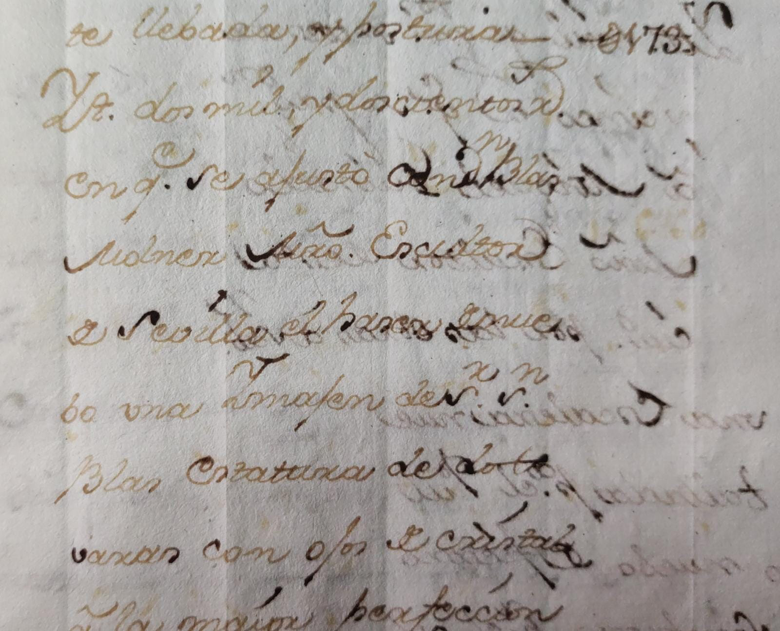 Tras estudiar los libros de fábrica de la extinta parroquia de San Blas hemos encontrado los pagos que se realizan a Blas Molner por valor de 2.200 reales12 (Figura 2). La imagen13, de tamaño algo superior al natural14 (Molner certifica que medía dos varas), porta báculo en la mano izquierda. En la derecha lleva un libro abierto con la curiosidad de que va su firma en una hoja “en Se…(villa) por Blas Molner na (tural) de Va (lencia)”. Se le representa como obispo con capa pluvial, roquete, túnica y mitra. La imagen es de gran dinamismo que se puede evidenciar en las ropas en movimiento, contraposto y tener abierta la capa pluvial. Presenta el brazo derecho en actitud de bendecir, al que acompaña con un cierto movimiento de la cabeza hacia la derecha. El rostro es de rasgos marcados, con ojos (de cristal) muy abiertos y boca entreabierta que deja ver los dientes superiores y nariz prominente. Comparte similitudes con los rostros del San Elías de la Concepción de Écija, con el Cristo de las Tres Caídas de Valverde del Camino (Huelva), el San Juan Nepomuceno de Lucena (Córdoba), el San Joaquín de la iglesia de San Andrés y el Crucificado de la capilla de San Telmo, ambas en Sevilla.