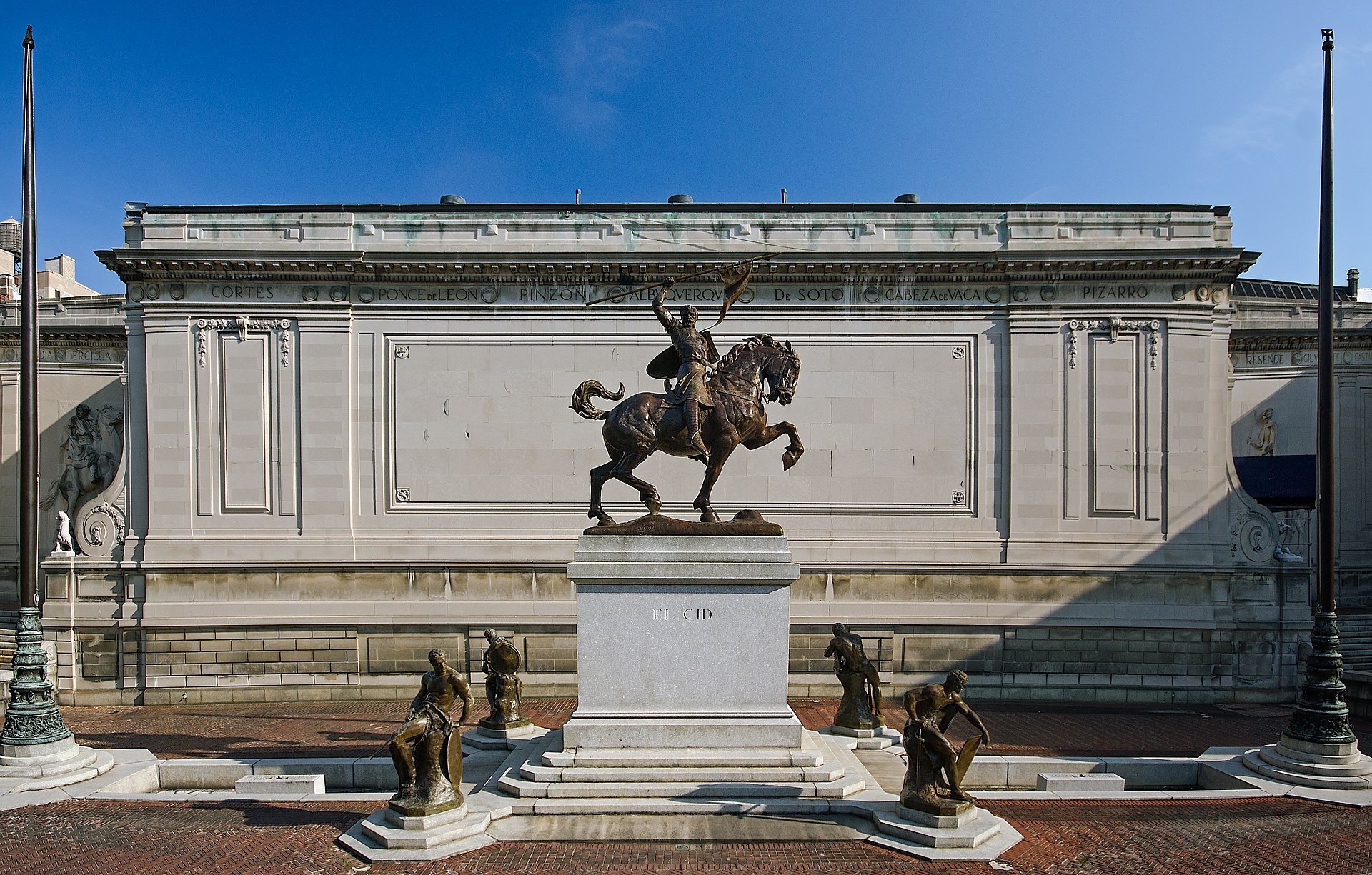 La norteamericana Anna Hyatt (1876-1973) es autora de esculturas emblemáticas como la estatua ecuestre del Cid Campeador. Tras casarse con Archer Milton Huntington (1870-1955), fundador de la Hispanic Society of America, compartió con el filántropo el amor por el hispanismo. La estatua, inaugurada en 1927, se ubicó frente a la fachada del Museo Hispánico de Nueva York. Una crónica del madrileño diario La Nación destacaba que el Cid había “resucitado” a orillas del Hudson. Una resurrección doble, pues, al mismo tiempo una réplica se levantó en Sevilla con motivo de la Exposición Iberoamericana. El mecenazgo del matrimonio Huntington se extendió por toda España y se conservan numerosas obras de Anna Hyatt, entre las que destaca la estatua del Cid.