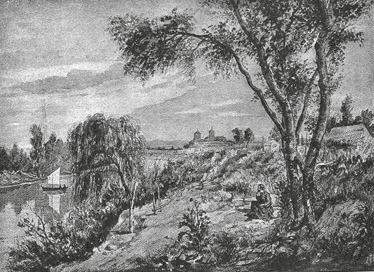 El romántico sevillano Manuel Cabral Bejarano (1827-1891) colabora con el atractivo dibujo titulado El sueño del poeta. Se trata de un bello paisaje de los alrededores de Sevilla con el Guadalquivir y el boscaje de su idílico entorno como testigo del retiro de Gustavo Adolfo, que busca en la soledad la inspiración. El autor evoca sus años de pintor romántico, por lo que, con intención de actualizar aquella estética isabelina con un toque sentimental, no tiene empacho en ambientar su obra bastante realista al modo placentero de los paisajistas de Barbizon. Para ello, coloca al poeta sentado y pensativo mirando el bello entorno que le rodea, con el monasterio de San Jerónimo en lontananza y el río fluyendo a su vera por el que surca un pequeño velero (fig. 2).