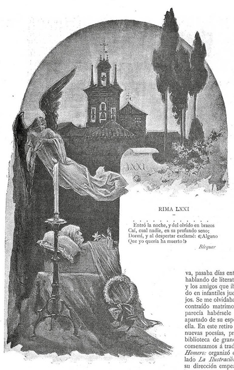 Su imaginaria y lúgubre escenificación, basada en la rima LXXI, sitúa en primer plano sobre un lecho mortuorio a un cadáver femenino envuelto en sudario, mientras un ángel se dispone a apagar la vela aún llameante de la vida. Al fondo se divisa una imaginaria espadaña conventual, que por su fisonomía bien pudiera ser la del sevillano monasterio de Santa Paula. En medio, los cipreses, como símbolo cementerial (fig. 4).