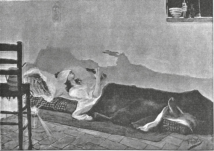 La obra es de estética realista y asunto social, toda vez que ofrece una escena de iconografía aparentemente cotidiana, prosaica y vulgar, aunque su lectura iconológica sea de naturaleza poética, simbólica y expresiva. Se localiza en una lúgubre habitación pobremente iluminada, con siniestro ventanuco y humildes enseres, protagonizada por una joven exánime con rostro envelado, que yace en un camastro y cuya sombra se proyecta en la pared contigua (fig. 7).