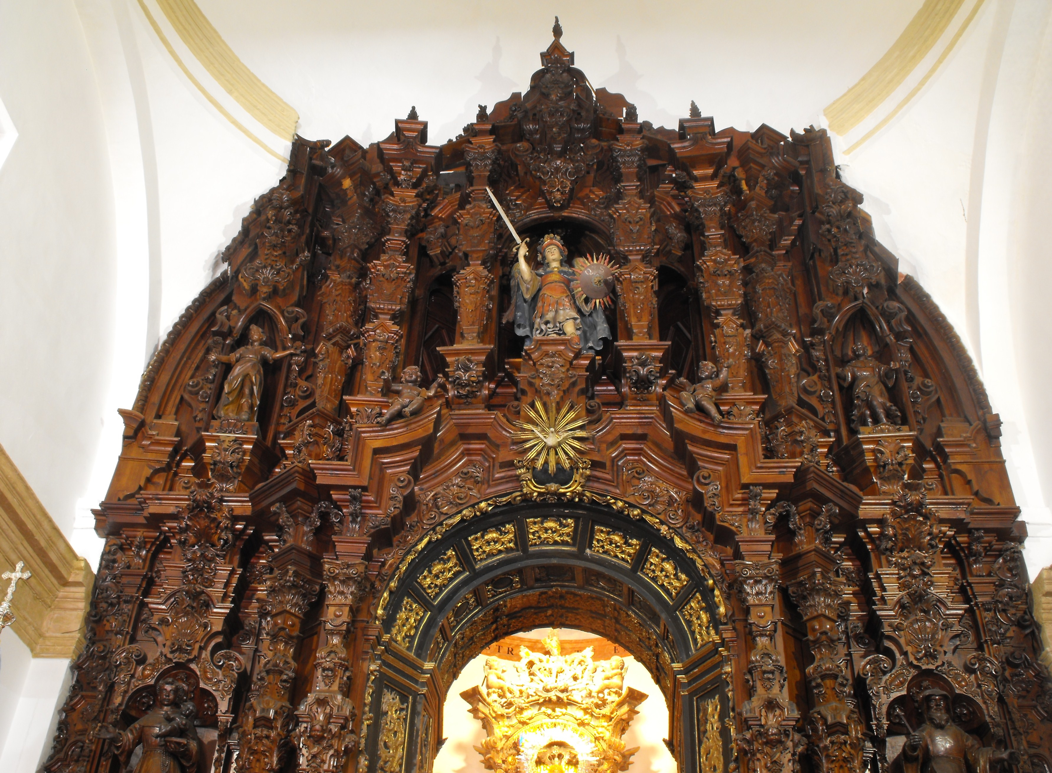 En cuanto al maestro que concluye el ático del retablo, Juan de Olarte, hay que destacar que era un artista local completamente desconocido hasta ahora. Lo hemos documentado esos mismos años, en concreto entre 1760 y 1762, recibiendo diversos encargos para la parroquia trebujenera, para la que hace piezas como son la cajonera de la sacristía, el tornavoz del púlpito y el cancel para la puerta principal, evolucionado en este último desde la estética del estípite al lenguaje rococó48.
