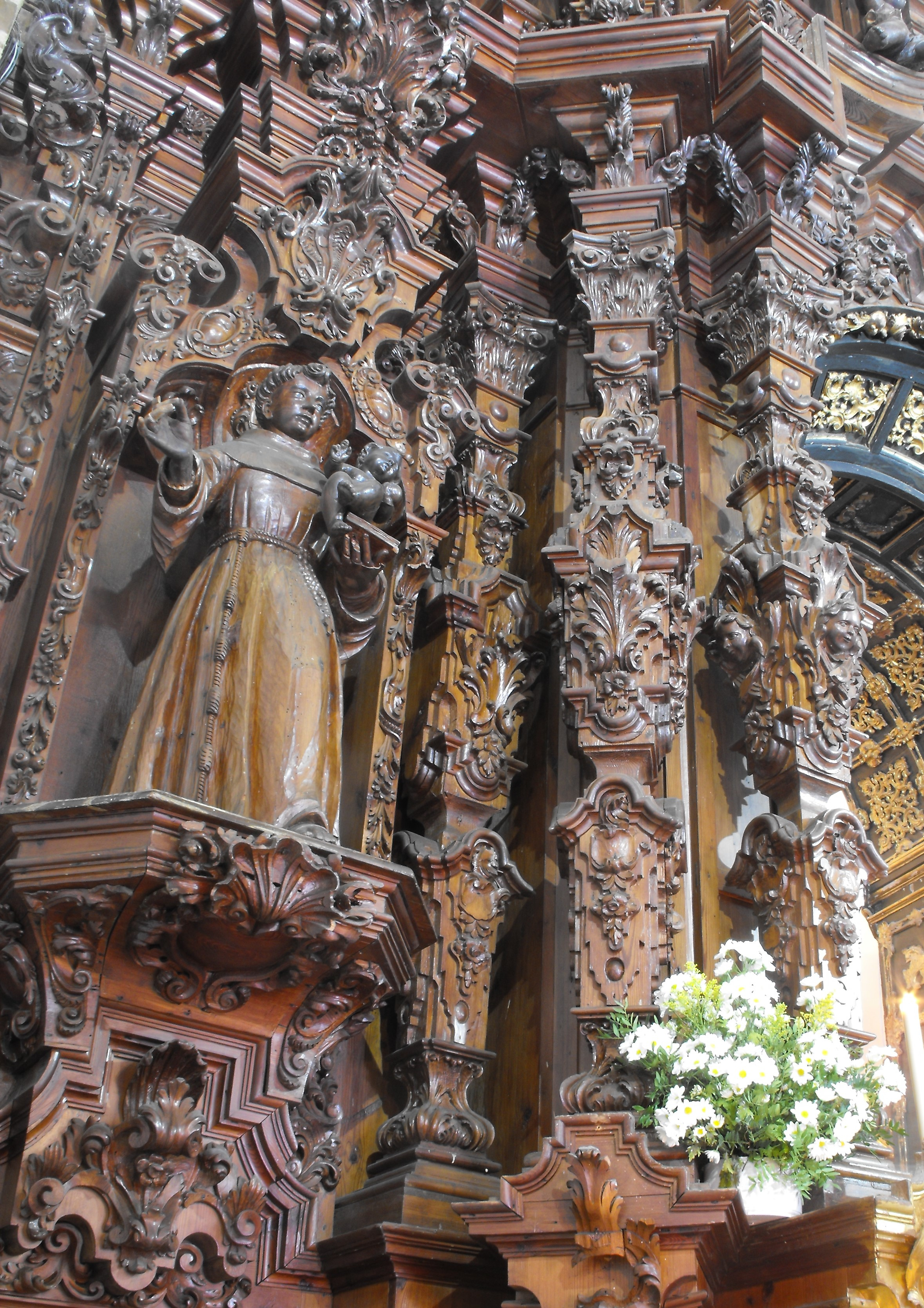 Pero, en general, las ornamentaciones con rocallas que se observan en determinados lugares de la estructura parece lógico atribuírselas a la intervención de Andrés Marín en 1772, ya que en uno de los recibos que éste firma se habla de la ejecución por su parte del “resto de talla que faltaba en dicho retablo”. Lo vemos en el interior de las hornacinas inferiores y, sobre todo, en torno a la embocadura del camarín, incluyendo el sagrario, articulado por dos pequeños y peculiares soportes de formas vegetales y diseño asimétrico, y que debió de completarse o reformarse en ese momento pues su puerta se decora con un relieve que se sabe que fue tallado por Diego Roldán en 1761.