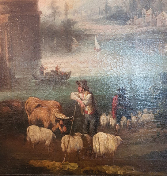 Por otro lado, en la parte derecha, se encuentra un joven curioso a cargo de los animales (Figura 4). Con una actitud tranquila e informal, aparece apoyado sobre un cayado dirigiendo la mirada hacia la mujer recolectora, mientras que su compañero pastorea las ovejas a sus espaldas. Como fue habitual en el costumbrismo hispalense, Cortés Aguilar representó en ejemplares como el presente los valores tradicionales del tipo sevillano, siempre desde un punto de vista dulce en el que no había cabida para la cruda realidad de entonces. Por el contrario, se trata de una escena típicamente de costumbres contextualizada en un ambiente idílico más parecido a una ciudad de la antigüedad, como si el río se tratara de la laguna Estigia y estuviera siendo atravesada por la barca de Caronte, que a la Sevilla de mediados del ochocientos. En todo ello contribuyen los destacados efectos atmosféricos, característicos en el pincel de este autor, que aportan en el paisaje sabores bucólicos propios de la pintura romántica.