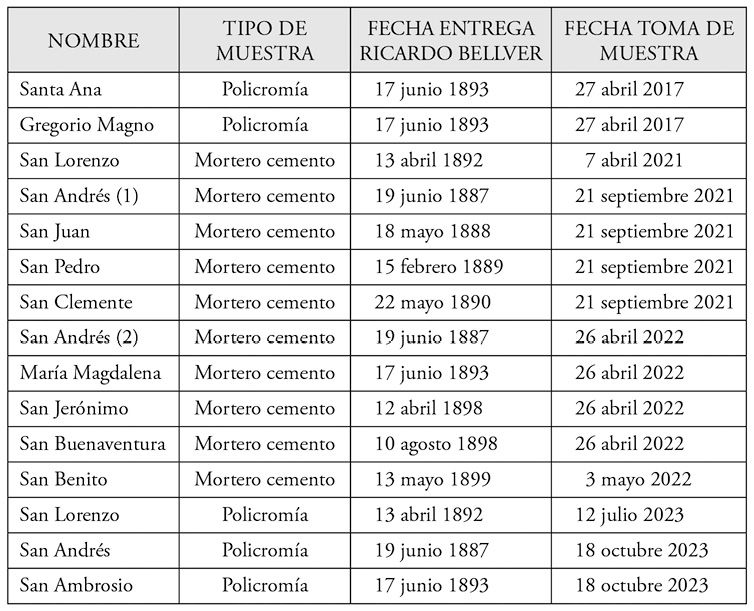 El estudio analítico realizado sobre los morteros45, correspondientes a cada una de las nueve entregas de esculturas ejecutadas por el escultor Ricardo Bellver, nos ha permitido conocer sus características principales en lo relativo a tipología general de morteros, árido empleado y recubrimientos existentes. También, en función de los datos obtenidos, se han podido establecer posibles diferencias y evoluciones entre las distintas partidas, que abarcan un periodo temporal de 12 años.