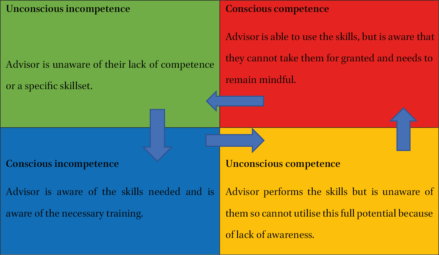 The professional development of advisors can be illustrated through a Four Stages Competence Model, adapted from “Four Stages for Learning Any New Skill”, as Figure 2 shows.