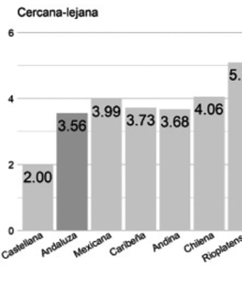 Cercana/lejana. Los hablantes rioplatenses que identificaron como europea a la variedad andaluza (2.99) la percibieron tan poco cercana como la castellana (3.12), con solo 2.16% de diferencia. Ambas variedades reciben una valoración cercana al valor neutro.