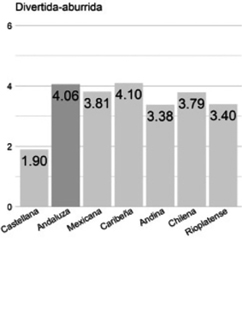 Divertida/aburrida. Los encuestados perciben la variedad andaluza (4.06) de manera casi opuesta a la variedad castellana (1.9). La distancia es del 36%, siendo la castellana la peor valorada por una gran diferencia y la andaluza la segunda mejor evaluada. Además, la andaluza (4.06) es considerada tan divertida como la caribeña (4.10), que es la mejor valorada. En menor medida, se acerca a la rioplatense (3.40), aunque en estos casos la distancia supera los parámetros de significancia establecidos (superan los 0.30 puntos de diferencia).