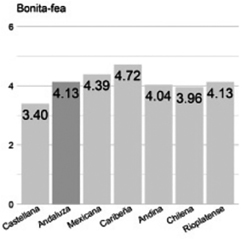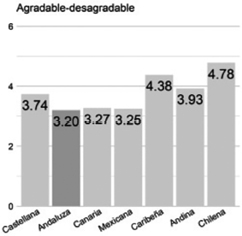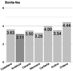 Bonita/fea. La variedad andaluza es vista tan bonita como la variedad rioplantense. Los valores son idénticos (4.13). Ambas se ubican en la tercera posición, en la escala de mejor a peor valoradas, seguidas de la variedad andina (4.04), de la que se alejan por solo 0.09 (1.5 %)[2].