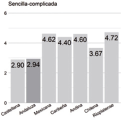 Sencilla/complicada. La variedad andaluza (2.94) recibe una valoración casi idéntica a la castellana (2.90). Es un 0.66% de diferencia. Ambas variedades son las dos peor evaluadas. Al mismo tiempo, se encuentra muy alejada de la rioplatense (4.72), percibida como la más sencilla, a 29.66%.