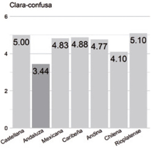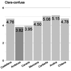 Clara/confusa. Para este rasgo, la variedad andaluza (3.44) es opuesta a la rioplatense (5.10). El contraste es máximo, pues la primera presenta el valor mínimo y la segunda, el máximo. Entre ambas hay 27.66% de diferencia en la escala de valores. También se opone a la castellana (5.00), la segunda mejor evaluada. La distancia es de 26%.