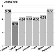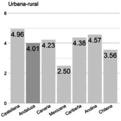 Urbana/rural. La andaluza es la peor valorada (3.63). No se la ve como muy urbana. La rioplatense (5.58) es la mejor valorada. Se ubican a 32.5% de distancia. También se opone por 32.16% a la variedad castellana (5.56), la segunda mejor evaluada.