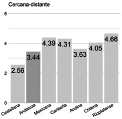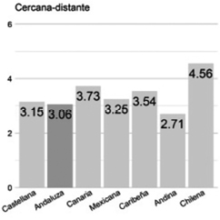 Cercana/distante. Para este rasgo, los valores medios de la voz andaluza (3.44) casi igualan a la andina (3.63) por 3.16% de diferencia y se encuentran a 20.33% de la rioplatense (4.66), percibida como más cercana. Es la segunda variedad menos valorada[3].