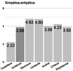 Agradable/desagradable. Es la menos agradable para los hablantes rioplatenses (3.20). La chilena (4.78) nuevamente se ubica en el polo contrario como la más agradable (diferencia de 26.33%). El valor más cercano lo tiene la variedad mexicana (3.25) a 0.83%[6].