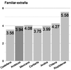 Familiar/extraña. La región andaluza (3.94) es percibida como casi idéntica a la andina (3.99), 0.83% de diferencia. La región se ubica también muy lejos de la rioplatense (5.58), la más familiar, con 27.33% de diferencia. No obstante, el contraste no es máximo, puesto que la variedad andaluza no representa el valor mínimo o el segundo menos valorado. De hecho, el rioplatense supera por más del 20% a todas las otras variedades[4].