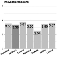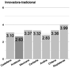 Innovadora/tradicional. La cultura andaluza (2.63) es percibida como la más tradicional, cerca de la andina (2.83). La diferencia es 3.33%. Ambas son las menos valoradas. La zona rioplatense, en el otro extremo, es la mejor valorada (3.99). La distancia entre la andaluza y la rioplatense es de 1.36, es decir, 22.66% de la escala de valores.