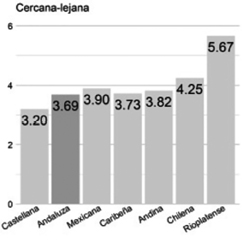 Cercana/lejana. La cultura andaluza (3.69) es percibida como la segunda más lejana, siendo la rioplatense (5.67) la mejor valorada (distancia del 33% de la escala)[5].