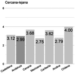 Cercana/distante. El valor más cercano al andaluz (3.06) corresponde a la variedad castellana (3.15). La distancia es 1.5%. Ambas reciben una valoración cercana al valor neutro (3) y son la segunda y tercera voz menos valoradas.