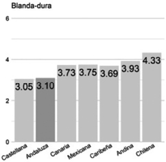 [2] En esta valoración, y en las restantes notas al pie, se describen criterios cuyos resultados, en mayor o menor medida, no alcanzan los parámetros de significancia establecidos en el apartado 3.1. Para la valoración directa, componente afectivo hay dos criterios que se mencionan seguidamente. Respecto de blanda/dura, la variedad andaluza (3.47) está valorada como cercana a la rioplatense (3.94), siendo estas la segunda y la tercera peor valoradas respectivamente. Y respecto de agradable/desagradable, la variedad andaluza (3.75) es la segunda peor valorada, después de la castellana (3.20), que es la menos apreciada.