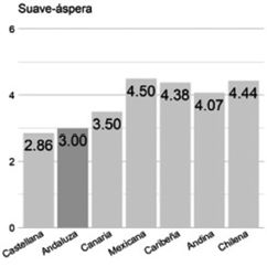 Suave/áspera. Para este rasgo, la percepción de la variedad andaluza (3.00) se encuentra muy cerca de la castellana (2.86). La distancia es de 2.33% del rango de valores.