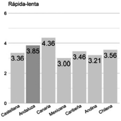 Rápida/lenta. La variedad andaluza (3.94) recibe valores semejantes a la rioplatense (4.06) con un 2% de diferencia. Son respectivamente la tercera y la segunda variedad evaluadas como más rápidas.