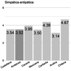Simpática/antipática. El valor promedio para la voz andaluza (3.52) se ubica a 0.02 de la variedad castellana (3.54). Es 0.33% del rango de valores[8].