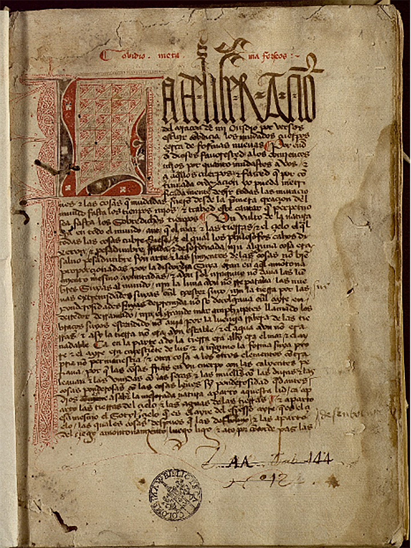 El poema mitológico con el que el poeta latino Publio Ovidio Nasón (43 a. C. - 17 d. C.) narraba la historia del mundo desde su creación, las Metamorfosis, cosechó en la Edad Media peninsular cierto éxito y desde el siglo xiii hasta el siglo xvi se benefició de varias traducciones independientes entre sí. A pesar de que contamos con testimonios de su empleo y copia en romance desde los trabajos historiográficos emanados del scriptorium alfonsí, la primera publicación de una versión vulgar autónoma en la Península se identificaba con la catalana de Francesc Alegre, dada a la imprenta en Barcelona en 1494. En castellano, habíamos de esperar a la traducción en prosa de Jorge de Bustamante, entregada a los tórculos de un taller desconocido hacia 1542. Hoy podemos añadir un eslabón más al inicio de esta cadena de versiones ovidianas: en algún día incierto del mes de junio del año 1536, Hernando Colón, el hijo del almirante, compró en Barcelona por «36 dineros» un códice cuatrocentista anónimo que contiene la que hasta el momento podemos proclamar como la primera versión castellana autónoma, hasta ahora no considerada, de las Metamorfosis ovidianas. Este testimonio, que desde que se trasladó a Sevilla en la primera mitad del siglo xvi no ha cambiado de ubicación, se conserva entre el conjunto de los libros legados por Hernando Colón, la llamada Biblioteca Colombina, y es custodiado hoy por la Institución Colombina, que también abraza los fondos de la Biblioteca Capitular de Sevilla.