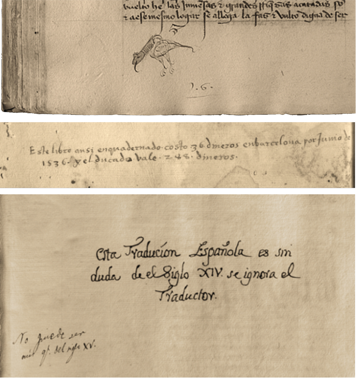 Por otra parte, en la primera hoja de guarda sucesivas anotaciones nos han devuelto una breve polémica sobre la datación aproximada del códice: mientras que una primera mano anota que «esta traducción española es sin duda del siglo XIV, se ignora el traductor» otra responde que «no puede ser más que del siglo XV» (Figura 4). El vaivén entre siglos también ha podido observarse en las dataciones que ofrecen las descripciones y los registros modernos del códice, como hemos tratado en el inicio de este apartado. Tras haber revisado y analizado las características lingüísticas y paleográficas del códice, no podemos más que darle la razón al segundo de los anotadores pues, efectivamente, se trata de un códice que puede datarse en torno a mediados del siglo xv.