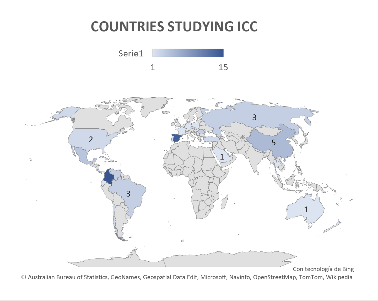 Another tendency found through this review deals with ICC and the geographic location of its studies, identifying many European and Latin American countries interested in this field as can be evidenced in Figure 3; this tendency, however, considers the fact that within the inclusion criteria established in the search protocol the languages Spanish, English and French were selected and some other studies might had been excluded due to this criterion.