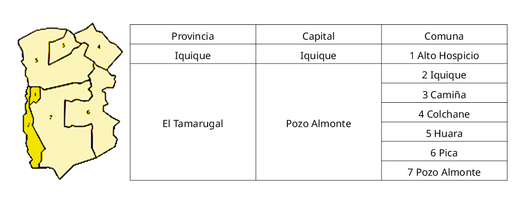 Fundación Wikimedia. Queñua, Gráfico y ubicación de comunas de la primera región de Tarapacá, norte de Chile. Recuperado de https://www.wikimedia.org.