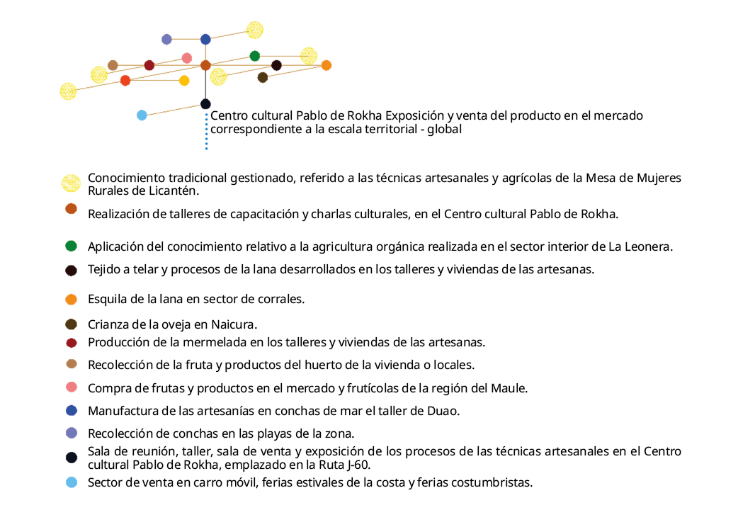 En el caso siguiente, correspondiente a la «Mesa de mujeres rurales de la comuna de Licantén, región del Muele, sur de Chile». Se verifico que, mediante la aplicación del esquema de interconexión e intercambio entre conocimientos, los vínculos que existían y que se extienden en el territorio donde funciona esta organización, hacen factible la inversión de recursos para desarrollar un proceso de gestión sostenible en este territorio. Debiendo a continuación evaluar las actividades y espacios comunes que fortalecen esta interconexión e intercambio, para así destinar las siguientes estrategias de gestión que generen nuevas actividades o desarrollo de proyectos que aporten a la conversión de estos C.T. en patrimonio y recursos para el desarrollo de esta comunidad.