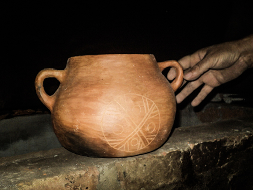 Fotografía 12. Vasija de greda en preparación con grabado del símbolo interpretado del cultrún mapuche Fuente: Adriana Maureira.