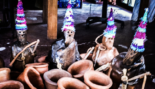 Fotografía 14. Figuras de greda que representan al encuerado personaje de la iconografía del “baile de los negros de Lora”, estas fueron realizadas por la señora Adriana Maureira, como producto artesanal de la Mesa de Mujeres Rurales de Licantén. Fuente: Autora.