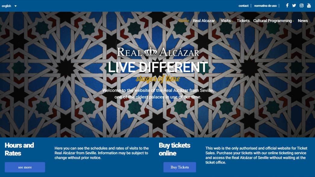 It should, however, be considered that the site is not attributable to an institutional tourism promotion body with the ability to strengthen its reliability (Seville, Andalusia or UNESCO). The content of the site is accurate and the main menu, through which you can access the various drop-down menus—Real Alcazar, Visits, Tickets, Cultural Programming and News—remains unchanged on all the pages.
