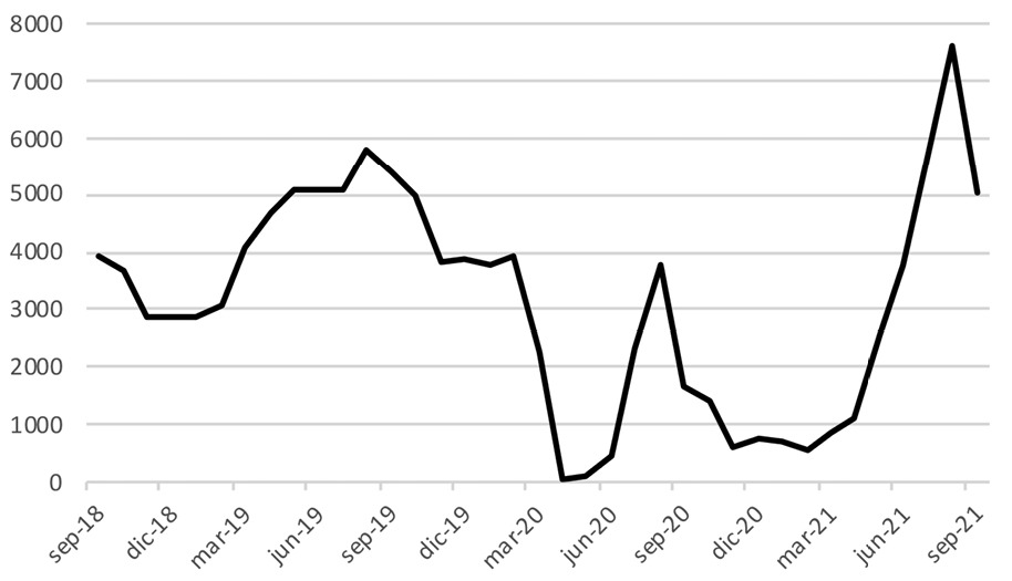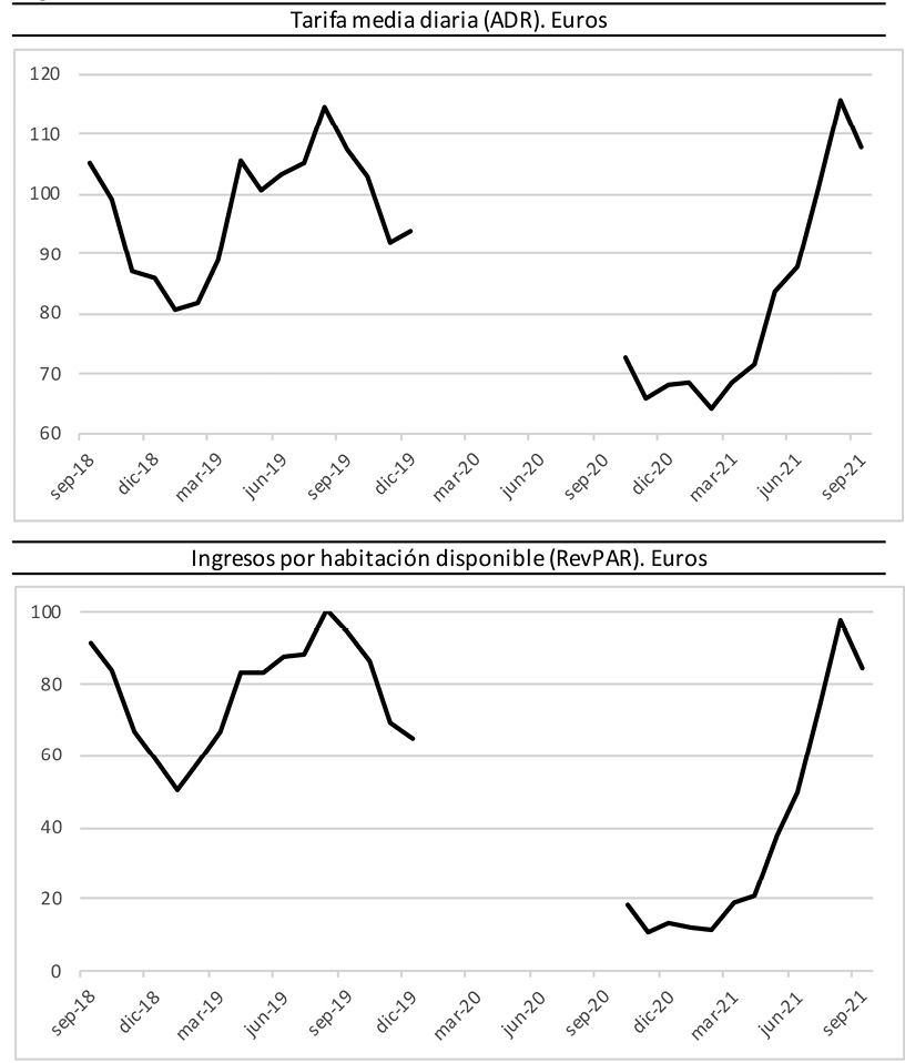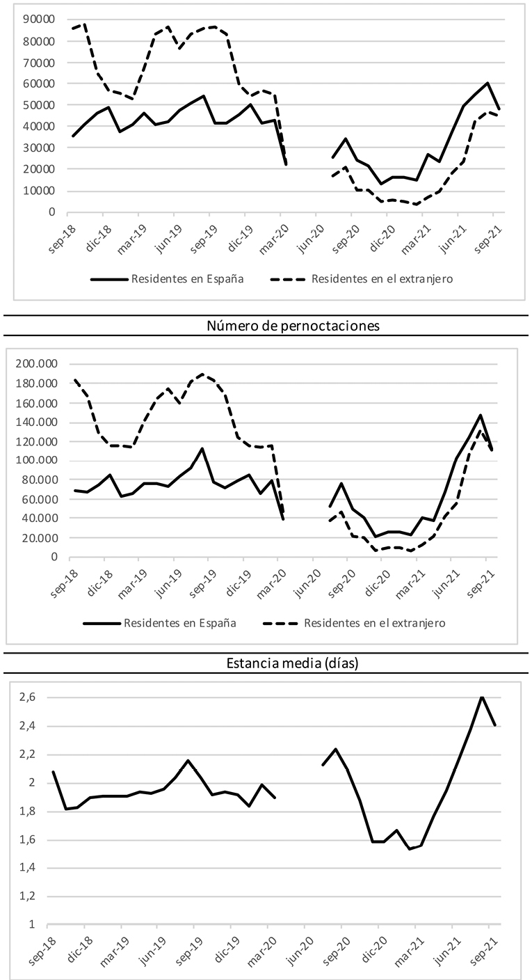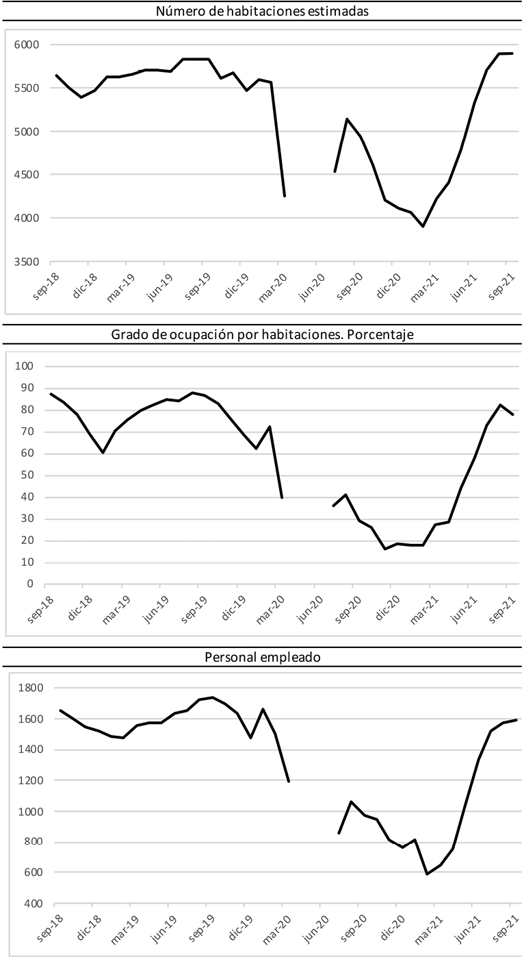 En cuanto al ámbito temporal hemos tomado como referencia el periodo comprendido entre septiembre de 2018 y el mismo mes del año 2021, es decir, antes de la pandemia y una vez que el sector turístico ha dado muestras de recuperación. No obstante, es necesario advertir que, dada la excepcionalidad que se vivió durante algunos meses de la pandemia, no siempre dispusimos de datos para todos los meses del periodo señalado, lo que ha provocado cierta discontinuidad en las series analizadas.