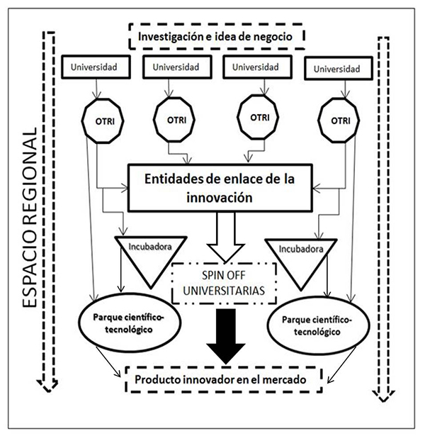 En este contexto teórico-conceptual, se plantea como hipótesis de la investigación la enorme necesidad de cooperación y colaboración en red entre los diferentes agentes y actores implicados en la región en el proceso de la puesta en el mercado de un producto innovador para poder alcanzar el objetivo final. Los casos de éxito de spin-off universitarias son muy pocos, pero muy importantes, tanto para la imagen de las universidades y centros de investigación, como para los gobiernos regionales. El apoyo a este emprendimiento universitario de alto nivel de I+D se ha afianzado como un vector de desarrollo y competitividad regional (González, 2008) desde hace más de una década.