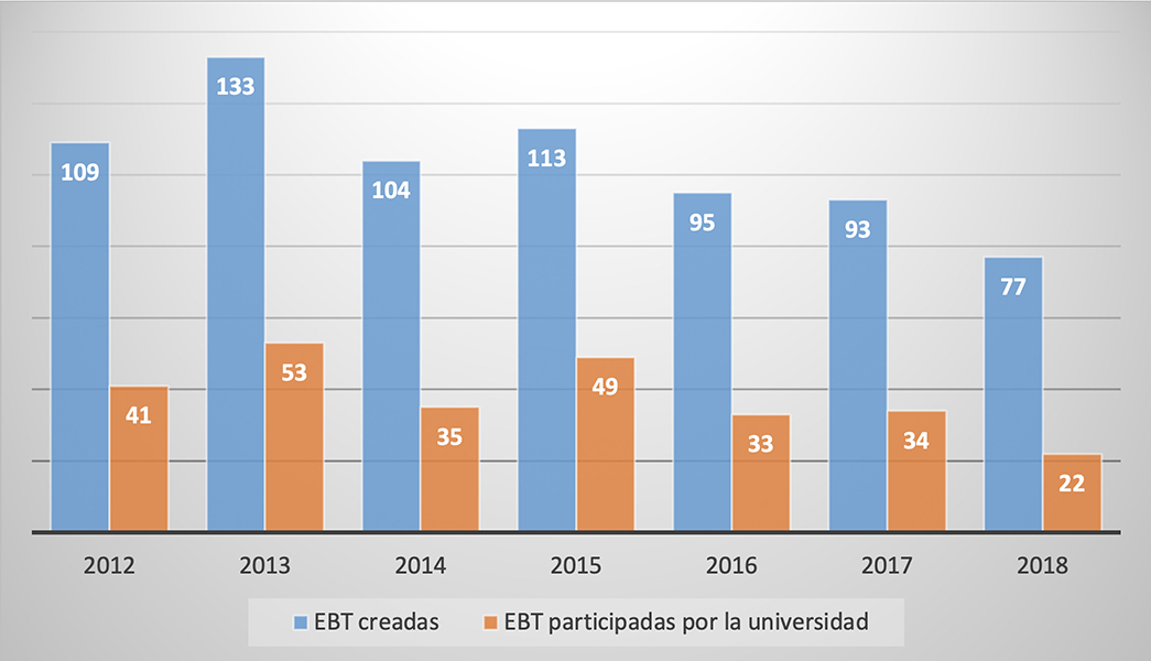 Gráfico 1. Número de spin-off universitarias (EBT) creadas y participadas por las universidades a escala nacional. Fuente: Encuesta I+TC 2019 de la Red OTRI (CRUE).