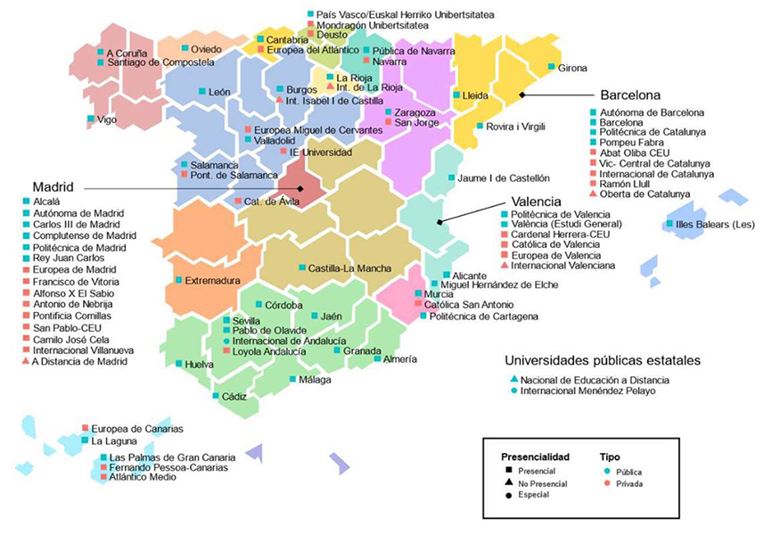 Mapa 1. Distribución geográfica de las universidades españolas con actividad en el curso 2019-2020. Fuente: Datos y Cifras del Sistema Universitario Español del Ministerio de Universidades.