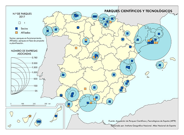 Mapa 2. Distribución de Parque Científicos y Tecnológicos en España en 2017. Fuente: Asociación de Parques Científicos y Tecnológicos de España (APTE), cartografía elaborada por el IGN. Atlas Nacional de España.