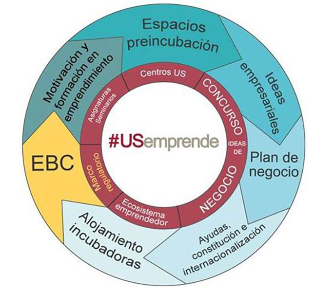 Figura 3. Proceso de creación de una empresa universitaria y categorías de servicios de apoyo desde la Universidad de Sevilla. Fuente: Secretaría de Transferencia del Conocimiento y Emprendimiento de la Universidad de Sevilla https://www.us.es/empresas/emprendimiento